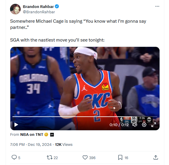 Poor Orlando. Already down Paolo and Franz, the Magic (17-12) lost Jalen Suggs to an ankle injury while he kickstarted a noble but futile second half comeback attempt against the Thunder (21-5). Suggs' initial ankle injury preceded a 10-1 run by OKC to end the half up 65-46. In that first half, Shai was merciless, going 10-11 and scoring 24 easy peasy points with an array of crafty footwork and shot artistry that made me wonder: why aren't we comparing him to Kobe?