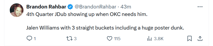 Suggs (temporarily) returned to start the third, and the gritty Magic held OKC to just 17 points in the frame. But after letting Orlando narrow the gap to 86-83 with 10 minutes remaining, a non-SGA unit finally played with some force. In a decisive string of possessions, JDub (who struggled and then some, shooting 5-15) punished Orlando's defenders in the paint and at the rim, and Isaiahs Joe and Hartenstein diced the Magic up for a 96-86 lead as SGA checked in to finish things off.