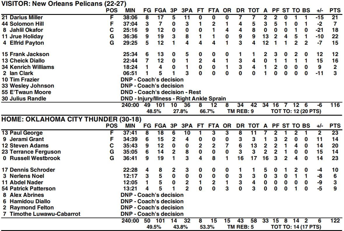 The Other Guys. Jrue Holiday led the Pelicans with 22 points, nine rebounds, and 13 assists — scoring 12 of his points in the fourth quarter to make it interesting. He was joined in double-figures by Darius Miller (21), Jahlil Okafor (18), Cheick Diallo (16), Elfrid Payton (15), and Frank Jackson (12). They outscored OKC 72-66 in the paint.