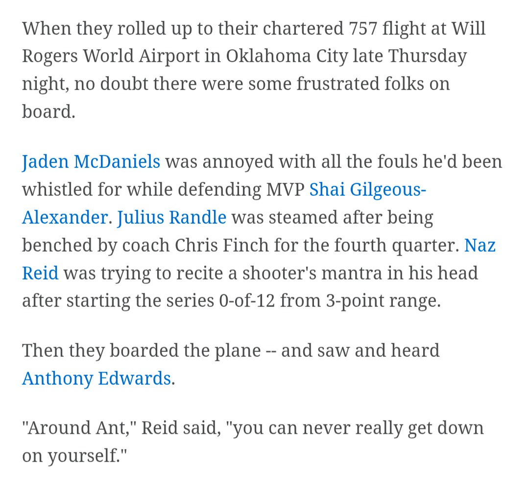 If you read the ESPN comics, good guy Ant is leading the ragtag Wolves against the big bad Thunder and the enforcement of legal guarding rules when SGA drives, with their lovable shover, a gigantic Sixth Man of the Year, an all-time rim defender, and an all-time...pouty chucker at his side. In my book, Minnesota is a highly pedigreed, expensively assembled title contender who doesn't need our sympathy.