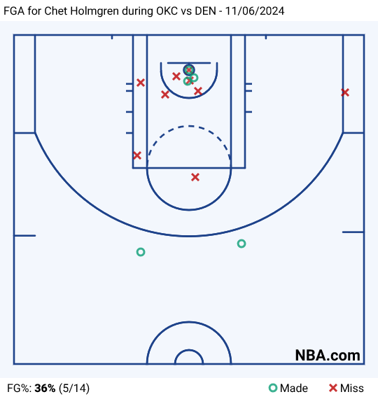 Oklahoma City (7-1) finally lost, failing to survive their first close game of the season in Denver (6-4). The game quite felt familiar midway through the third quarter, when OKC went up 78-62 thanks to a Chet Holmgren dunk. Holmgren (15 & 10 on a very ugly 5-14 shooting) and the Thunder weren't firing on all cylinders, but they were playing defense and getting enough from their stars (28 for SGA, 29/10/9 for JDub) to stay comfortably ahead.