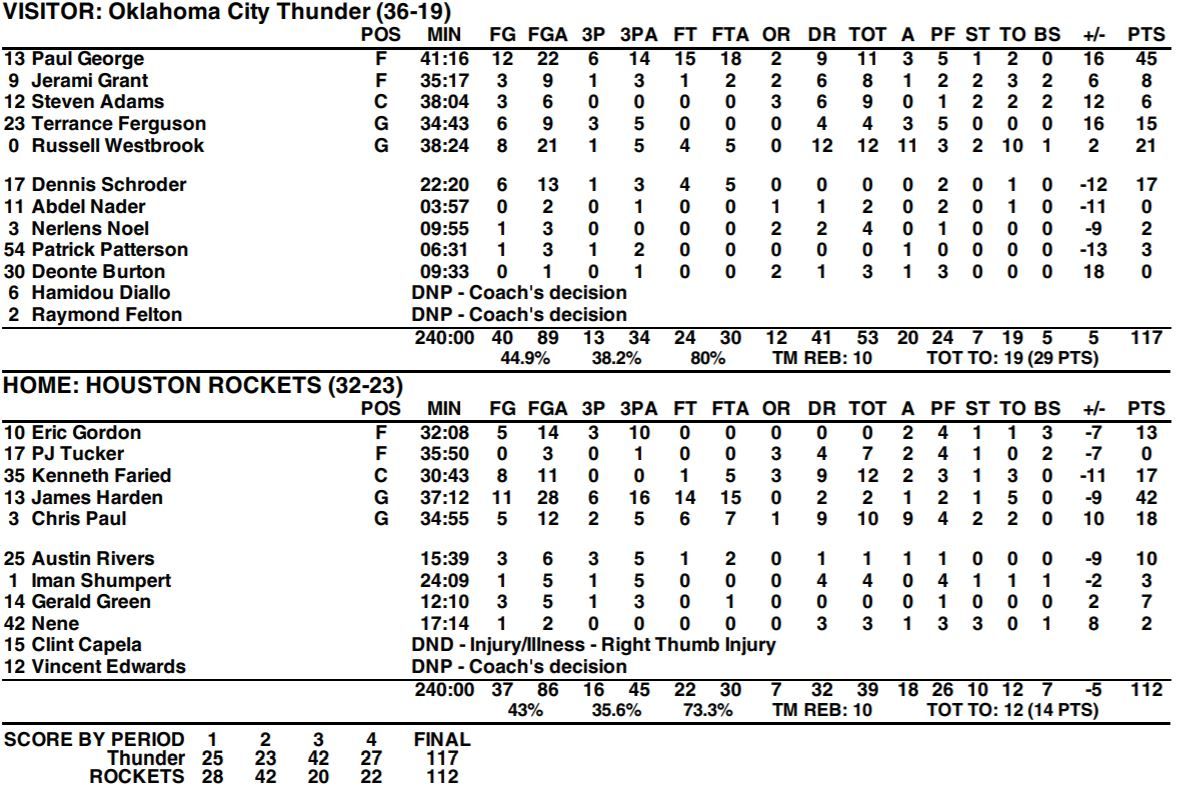 The Oklahoma City Thunder (36-19) won their third game in a row on Saturday night in Houston, defeating the Rockets (32-23) by a final score of 117-112. The Thunder trailed by as many as 26 points in the third quarter before a monstrous comeback sparked by Paul George, Dennis Schroder, and Terrance Ferguson. Russell Westbrook recorded his ninth consecutive triple-double in the win, tying Wilt Chamberlain for the longest streak in NBA history. James Harden finished with 42 points for the Rockets.