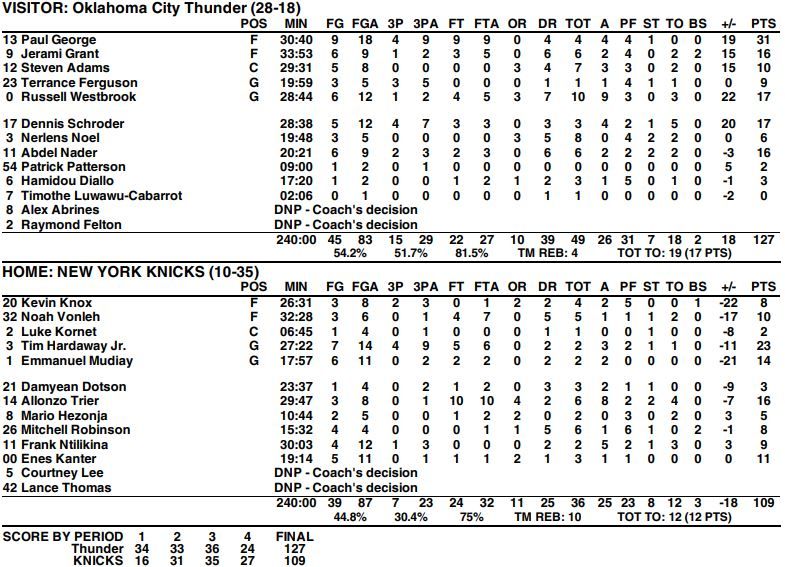The Oklahoma City Thunder (28-18) picked up an easy win on Martin Luther King Day, beating the New York Knicks (10-35) by a final score of 127-109 at Madison Square Garden. Paul George scored 13 of his game-high 31 points in the first quarter to put the Thunder up by as many as 20 in the opening frame. The Knicks only got as close as 14 from that point forward, as the Thunder went 15-of-29 (51.7 percent) from long range and dominated throughout.