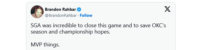 The Thunder are closer to a title than they've ever been before. In what might soon be recognized as a career-defining closing stretch by Shai (35 pts, 3 rbs, 0 ast, 4 stk), Shai delivered 15 mega clutch points to close the fourth quarter and steal a desperation win on the road. JDub (27 pts, 7 rbs), Chet (14 & 15), and Alex Caruso (20 pts, 5 stl, 1 blk) bounced back enough to buttress OKC's dead cold sharing (11 team assists, 13 turnovers) and shooting (3-16 3FGA) night, keeping the game close enough for the SGA-fueled comeback that turned a 10-point deficit late in the third into a 7-point win with the season on the line.