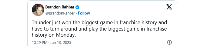 Next up: two days of rest before the Thunder play the most important franchise game, again, at home on Monday.
