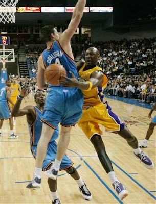 Oh yeah, the Thunder. The team played like its typically feisty self in the last preseason tuner, hanging around and scrapping all game long, but coming up short, 105-94 to the Lakers (6-2). One key stretch stood out tonight as the difference in this game. Oklahoma City (1-6) had closed the gap on LA to two late in the third with a 7-0 run to cut it to 77-75. They were hustling, making plays and hitting shots. It looked like the game was going to turn into a fourth quarter gruelfest. But then the tide turned.